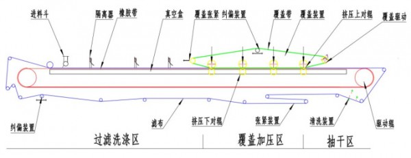 環(huán)形過濾膠帶由電機經(jīng)減速驅(qū)動連續(xù)運行,濾布鋪敷在膠帶上與之同步運行。膠帶與真空室滑臺接觸(真空室與膠帶間有環(huán)形磨擦帶并通入水形成水密封),當真空室接通真空系統(tǒng)時,在膠帶上形成真空,料漿由布料器均勻地布在濾布上,在真空的作用下,濾液穿過濾布經(jīng)膠帶上的橫溝槽匯總并由膠帶中心小孔進入真空室,固體顆粒被截留而形式濾餅;進入真空的液體經(jīng)氣水分離器排出。隨著橡膠帶移動已形成的濾餅依次進入濾餅抽濾區(qū)、覆蓋區(qū)、抽干區(qū);在上下濾布共同包裹下,形成高真空區(qū)域,抽出濾餅中的水分,同時在覆蓋區(qū)有擠壓輥與對輥,在氣缸高壓力線接觸作用下擠壓濾餅,去除濾餅水份;經(jīng)過抽干區(qū)進一步脫水,濾布與膠帶分開,在卸濾餅輥處將濾餅卸出;卸除濾餅的濾布經(jīng)清洗后獲得再生;再經(jīng)過一組支承輥和糾偏裝置后重新進入過濾區(qū)。