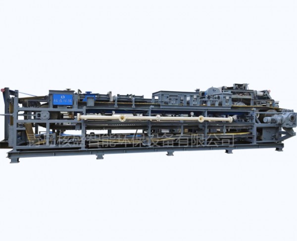 履帶式真空壓榨脫水機由履帶覆蓋裝置、橡膠濾帶、真空箱、驅(qū)動輥、膠帶支承臺、進料斗、濾布糾偏裝置、驅(qū)動裝置、濾布洗滌裝置、對輥壓榨、機架等部件組成。它是充分利用物料重力、真空吸力、雙濾布擠壓和對輥壓榨實現(xiàn)固液分離的效率很高的設備。
