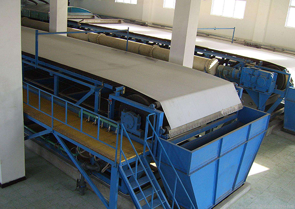 真空過濾機是以真空負壓為推動力實現(xiàn)固液分離的設(shè)備,在結(jié)構(gòu)上,過濾區(qū)段沿水平長度方向布置,可以連續(xù)完成過濾、洗滌、吸干、濾布再生等作業(yè)。